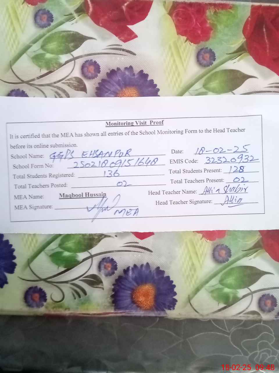 | Attendance Register | Head Teacher | MEA with School | Visit Proof |