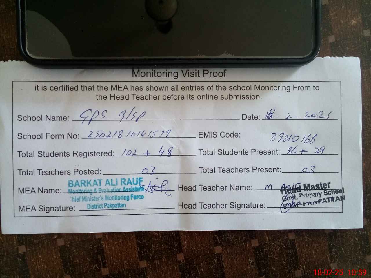 | Name: MAS**** Designation: (School Headmaster's/Headmistress's) PST Phone/Cell Number: 03**** |