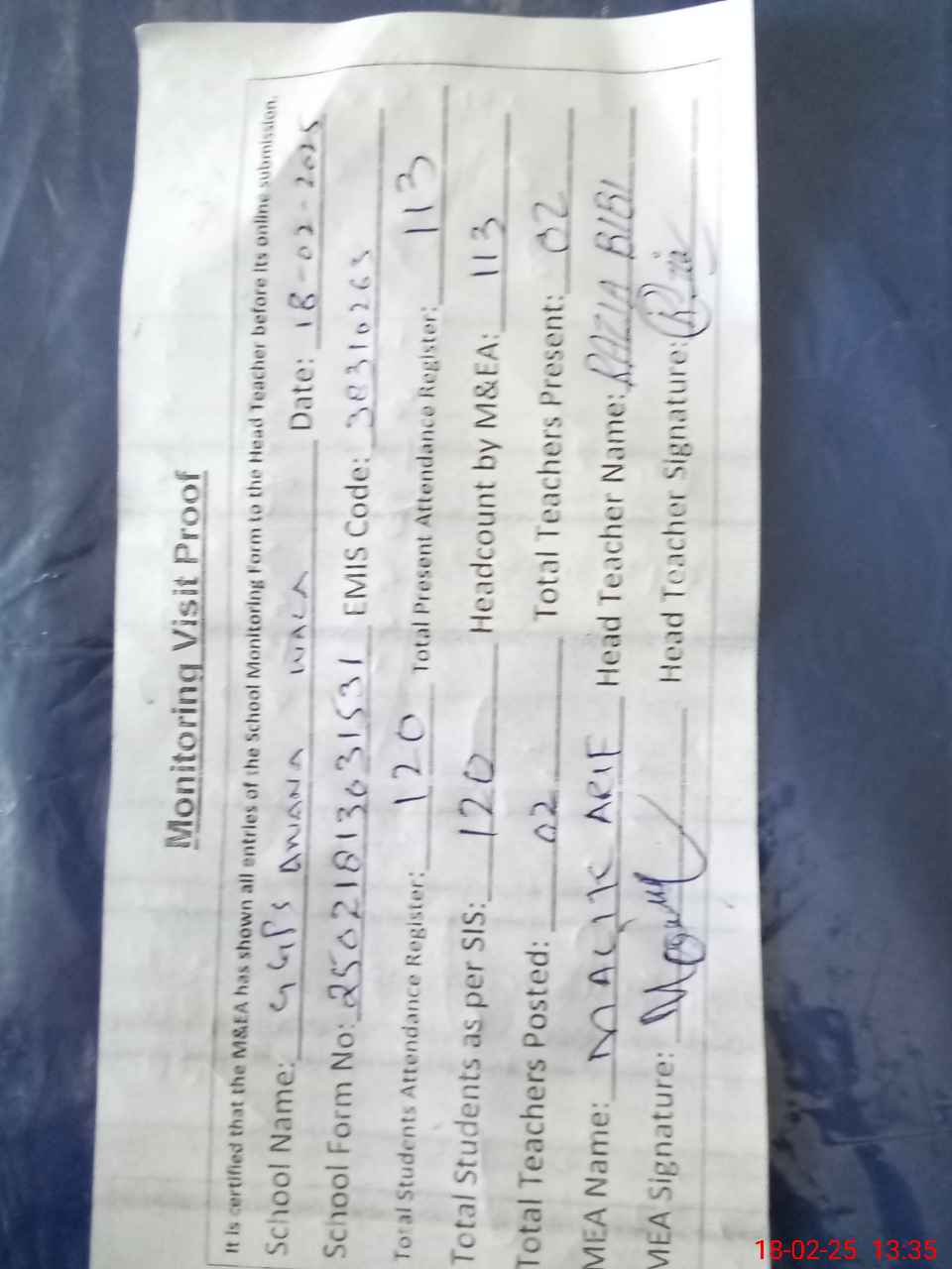 | Attendance Register | Head Teacher | MEA with School | Visit Proof |