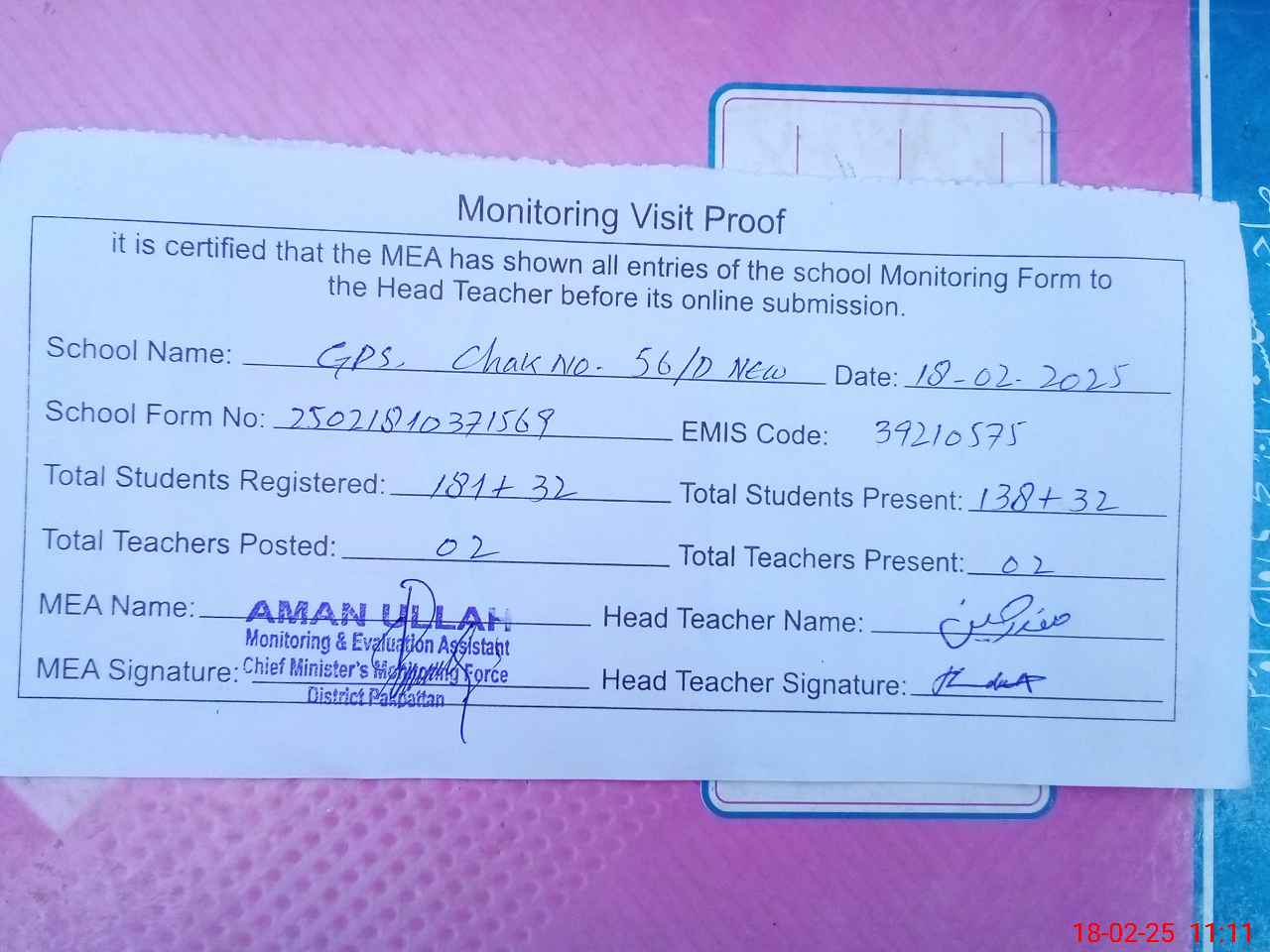 | Attendance Register | Head Teacher | MEA with School | Visit Proof |