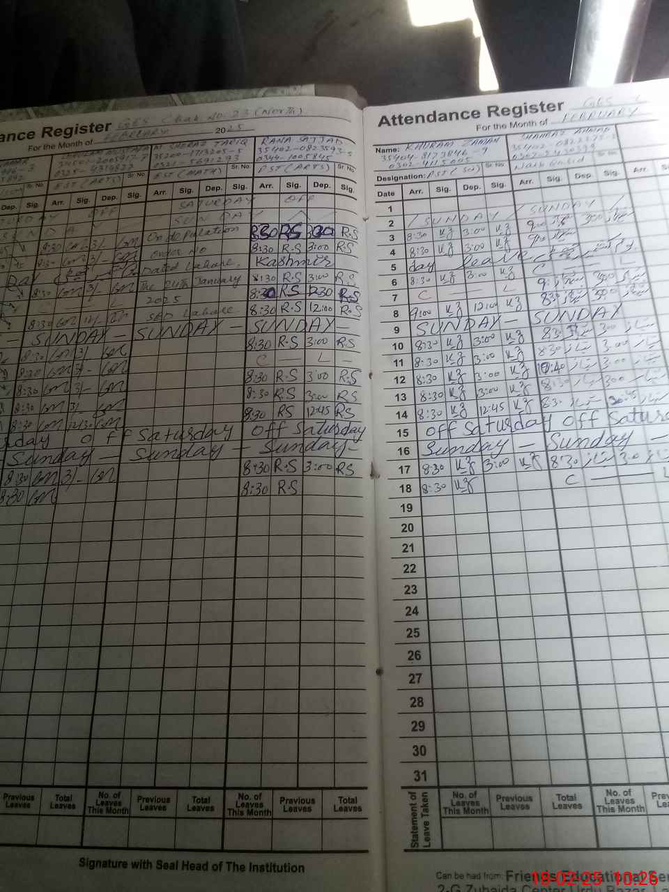 | CNIC | Full Name | Designation | R/C | Absence During Last Calender Month |
