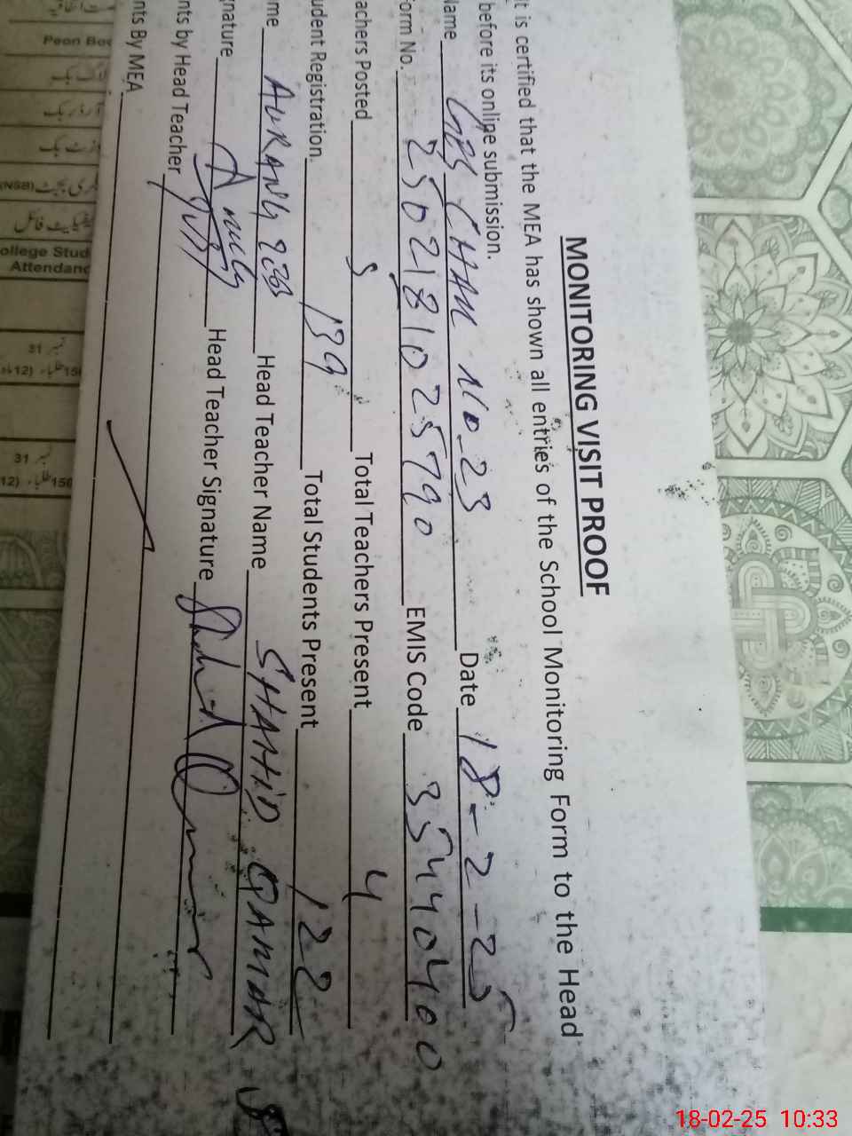 | Attendance Register | Head Teacher | MEA with School | Visit Proof |