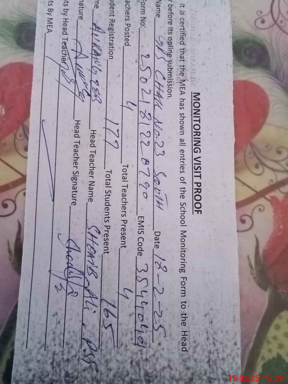 | Attendance Register | Head Teacher | MEA with School | Visit Proof |