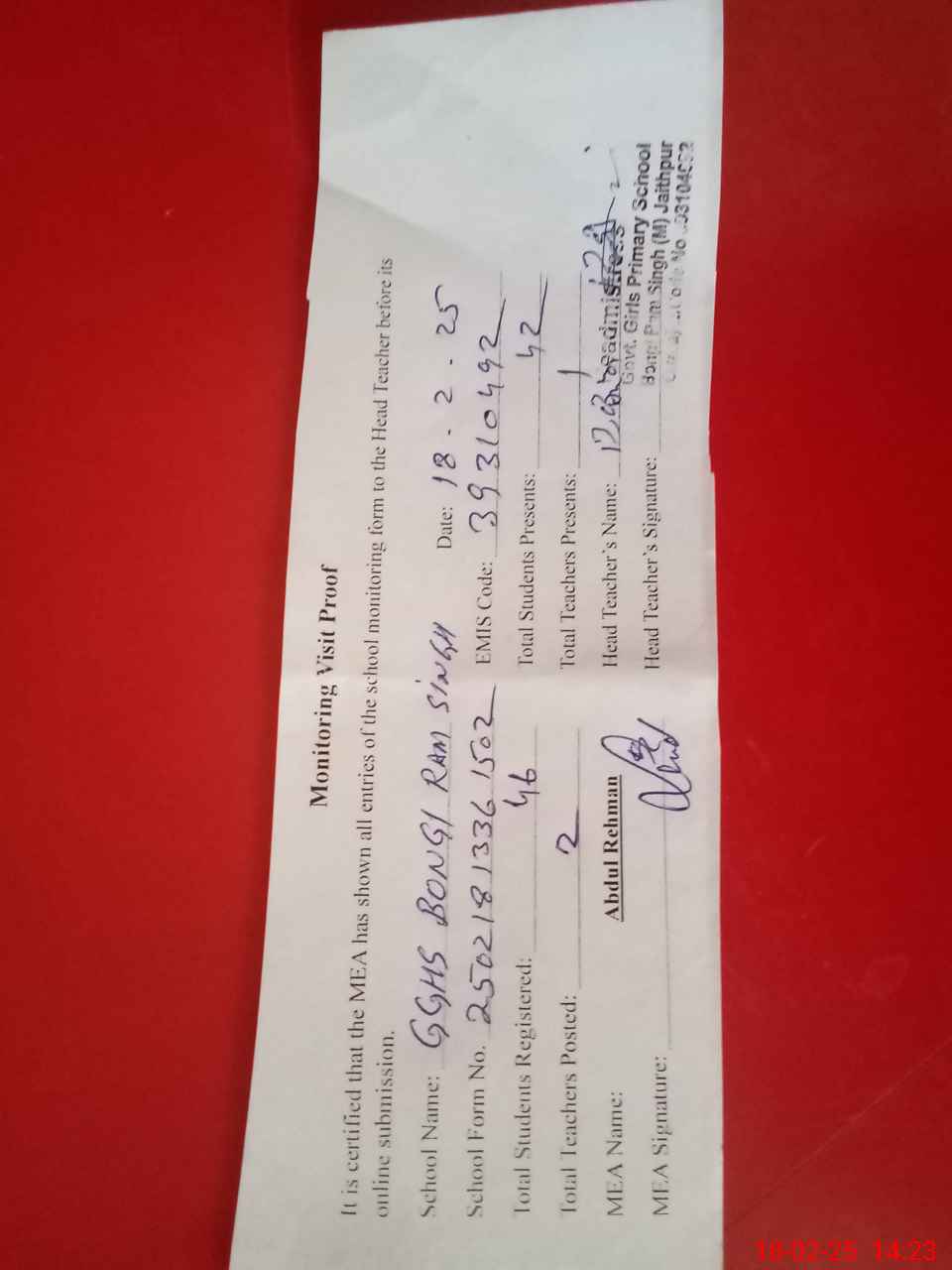 | Attendance Register | Head Teacher | MEA with School | Visit Proof |