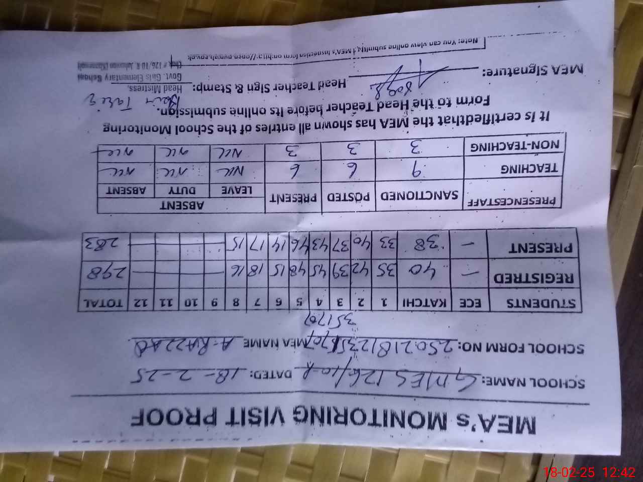 | Attendance Register | Head Teacher | MEA with School | Visit Proof |