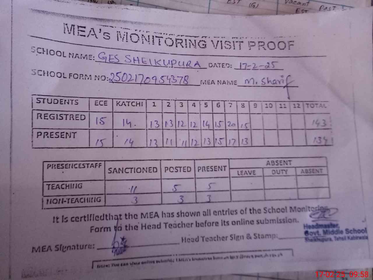 | Attendance Register | Head Teacher | MEA with School | Visit Proof |