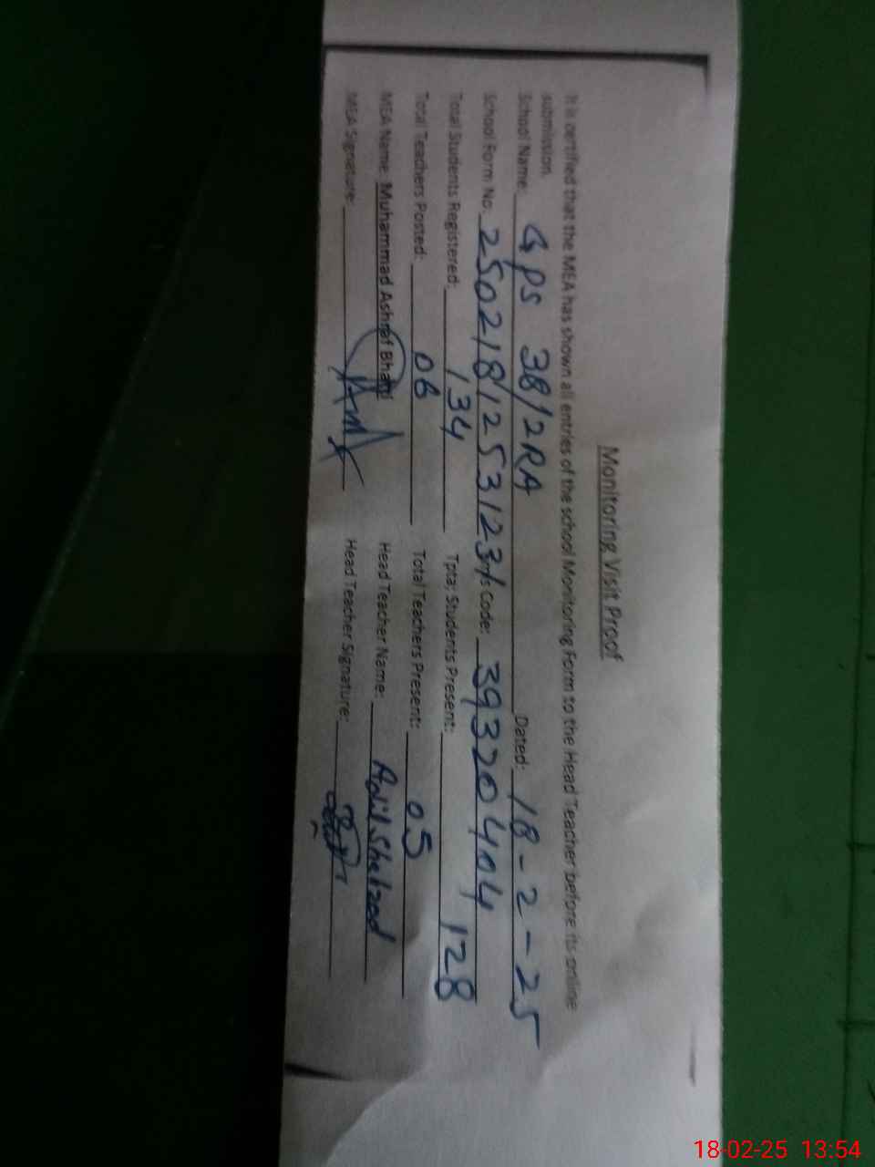 | Attendance Register | Head Teacher | MEA with School | Visit Proof |