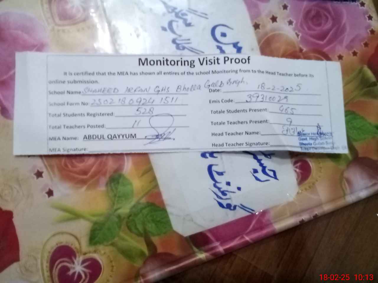 | Certified that this School was Inspected by the Undersigned MEA/DMO Today and the Information Stated Above is as Per Record. | |||||