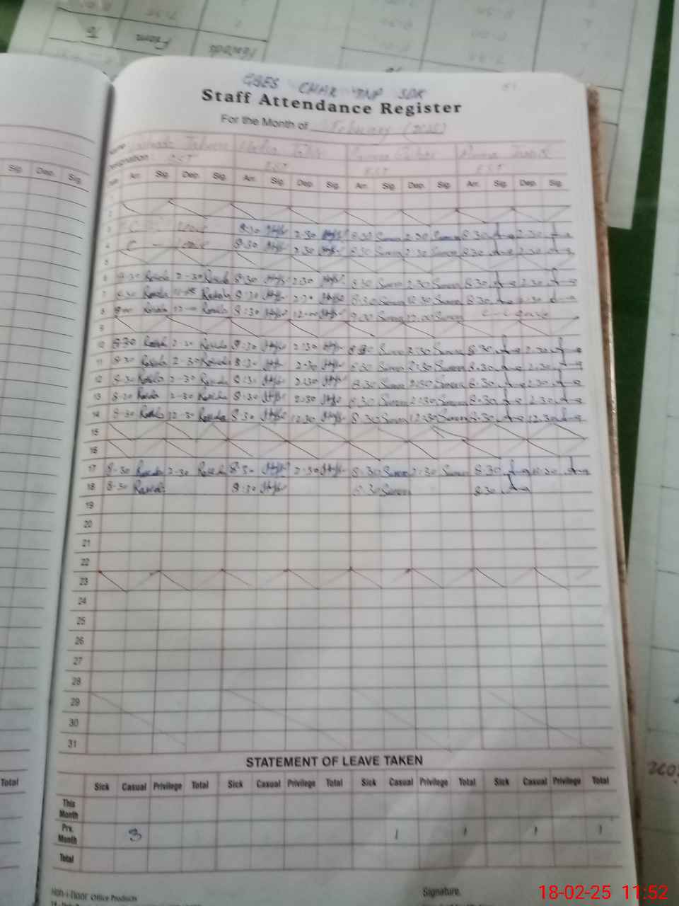 | No. of Students Present - Female | 28 | 0 | 36 | 32 | 37 | 16 | 23 | 26 | 26 | 18 | 23 | 265 | ||||