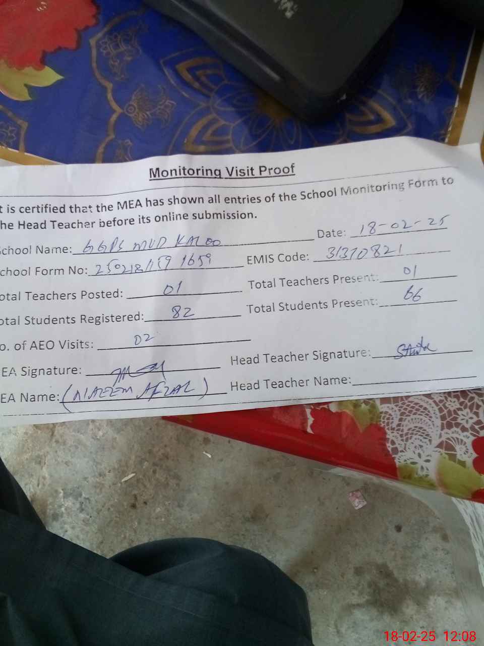 | Attendance Register | Head Teacher | MEA with School | Visit Proof |