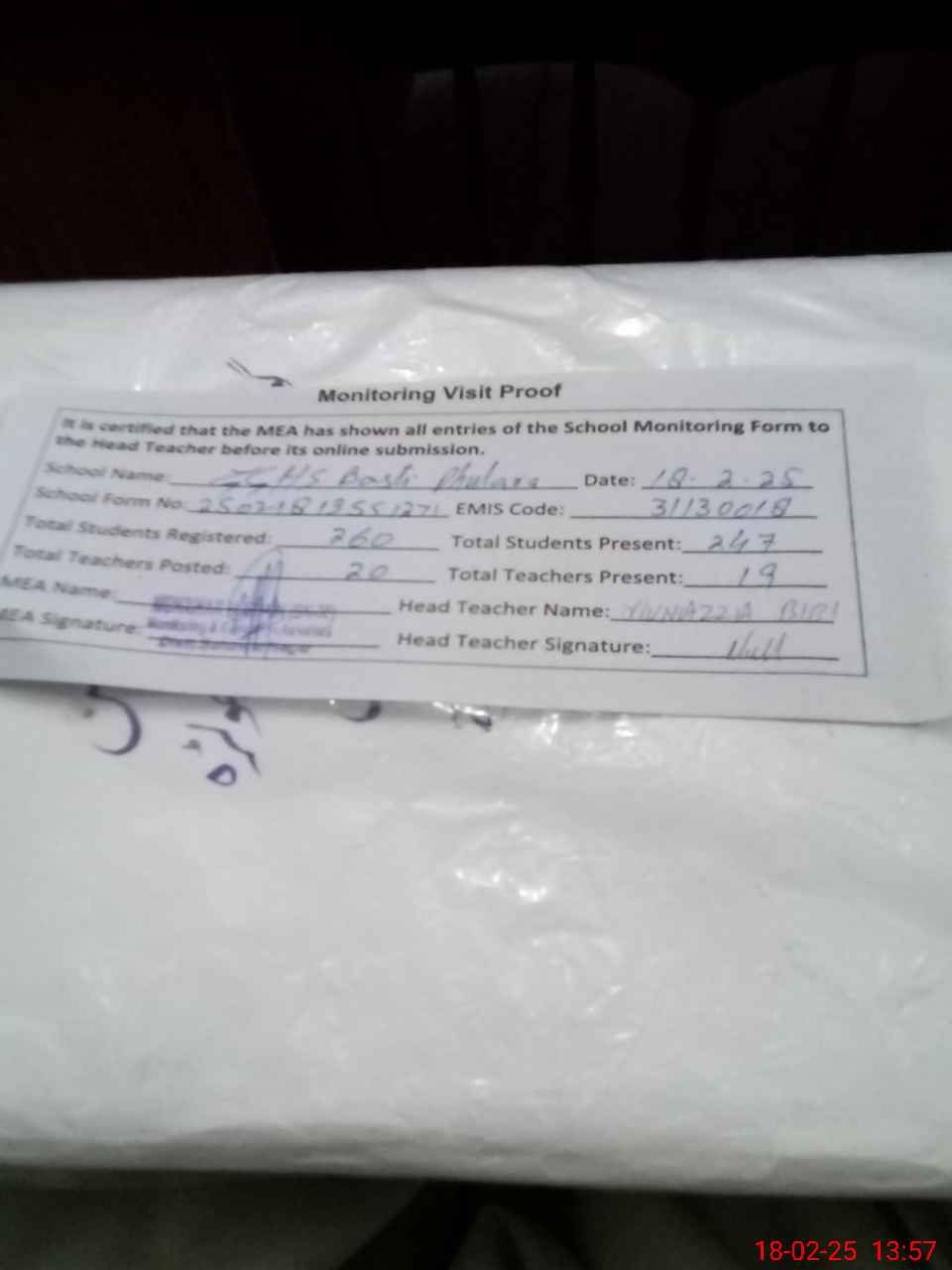 | Attendance Register | Head Teacher | MEA with School | Visit Proof |