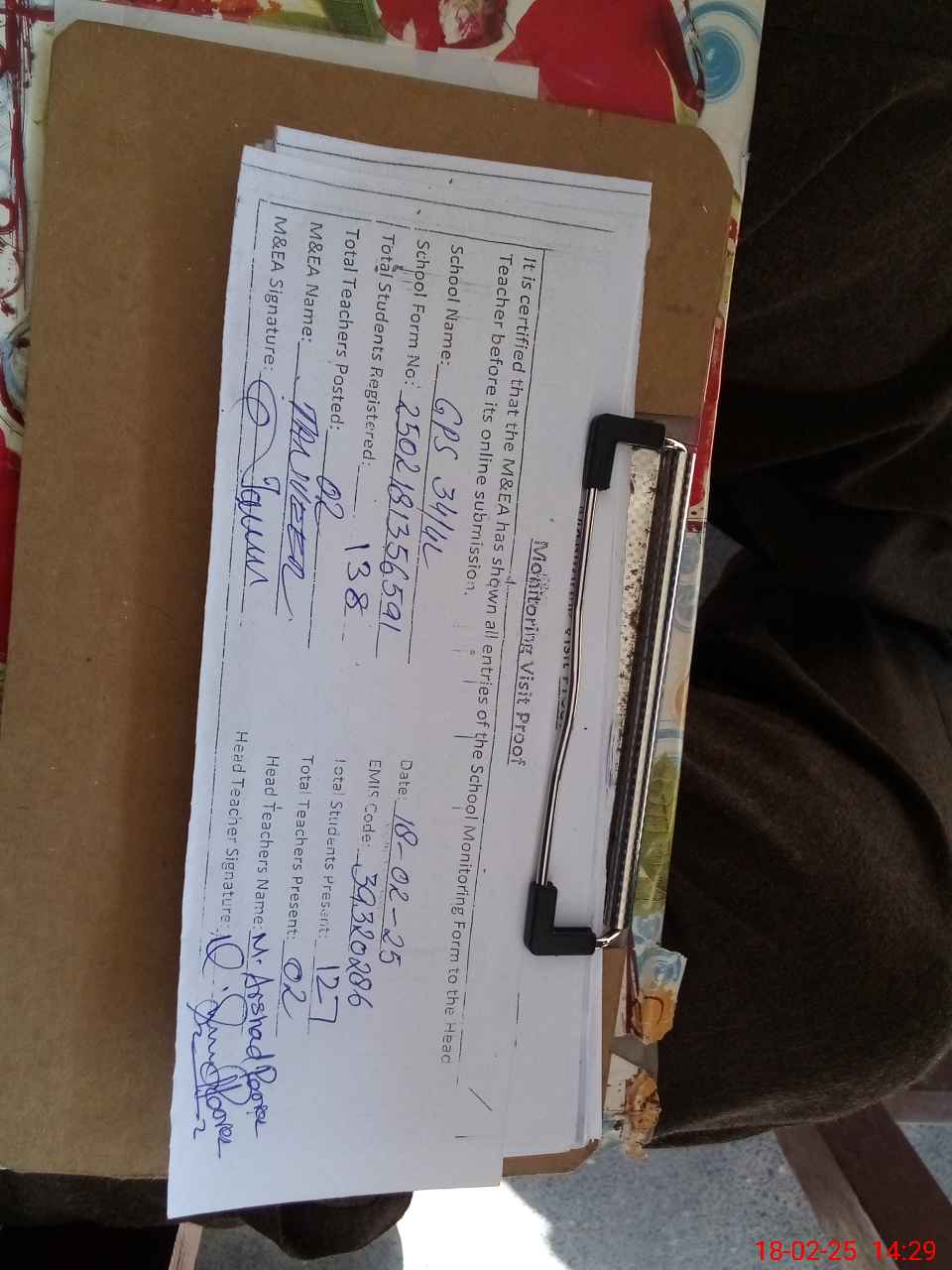 | Attendance Register | Head Teacher | MEA with School | Visit Proof |