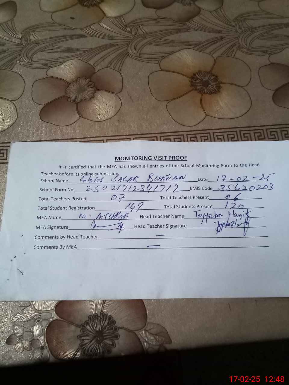 | Attendance Register | Head Teacher | MEA with School | Visit Proof |