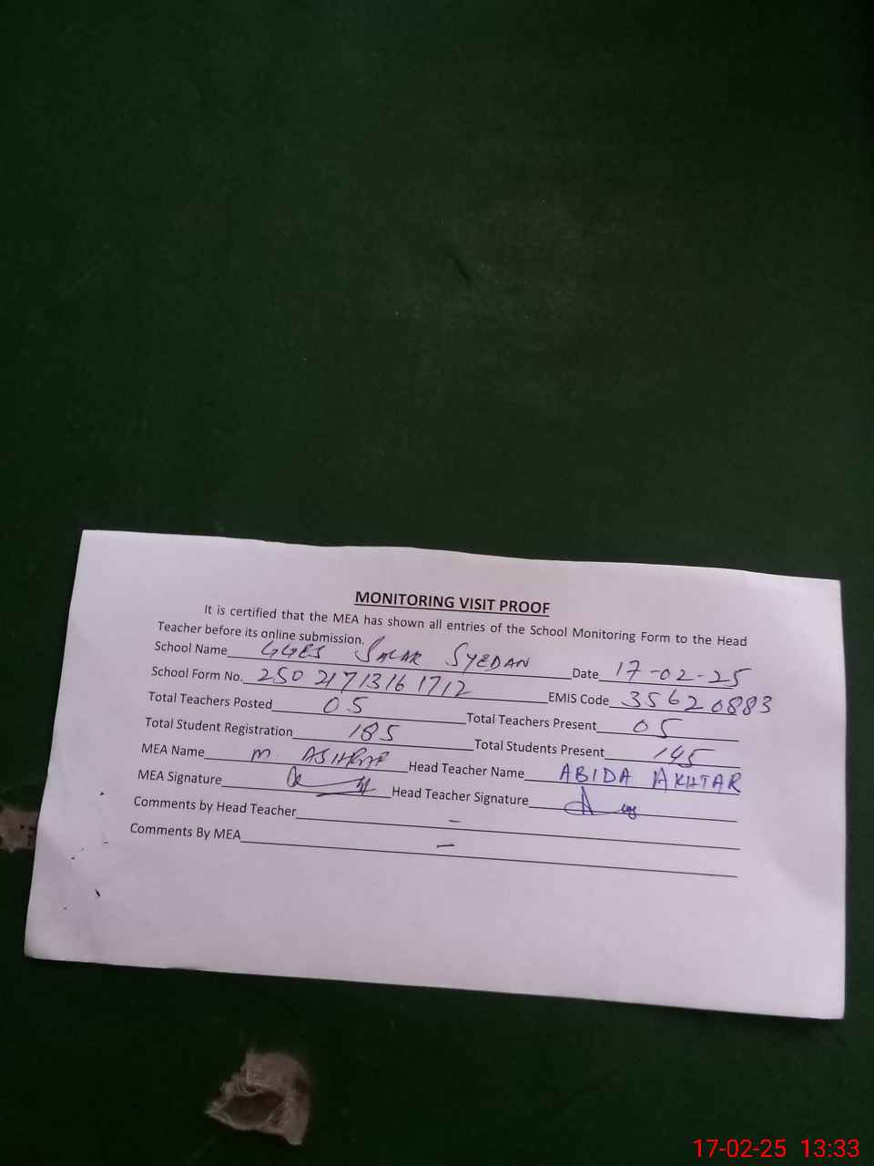 | Attendance Register | Head Teacher | MEA with School | Visit Proof |
