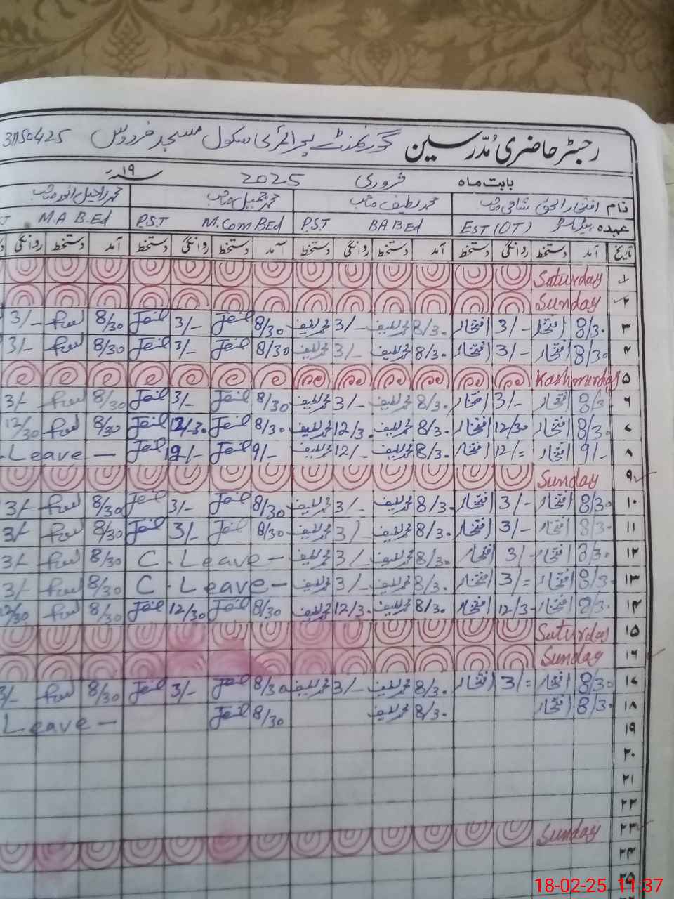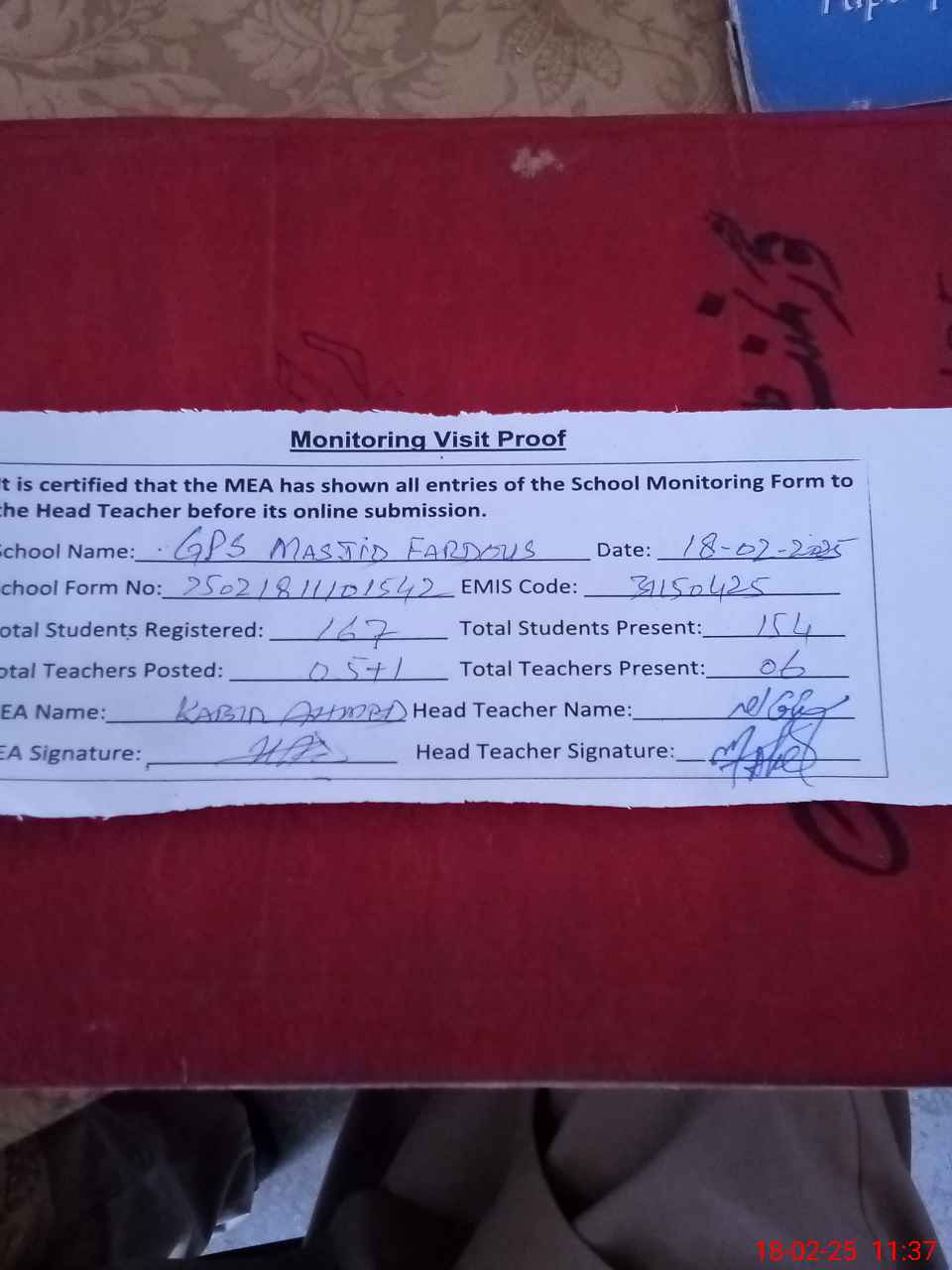 | EMIS Code: 31150425 | Name of School: GPS MASJID FARDOUS | |||