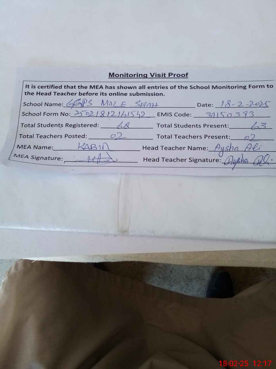 | Attendance Register | Head Teacher | MEA with School | Visit Proof |