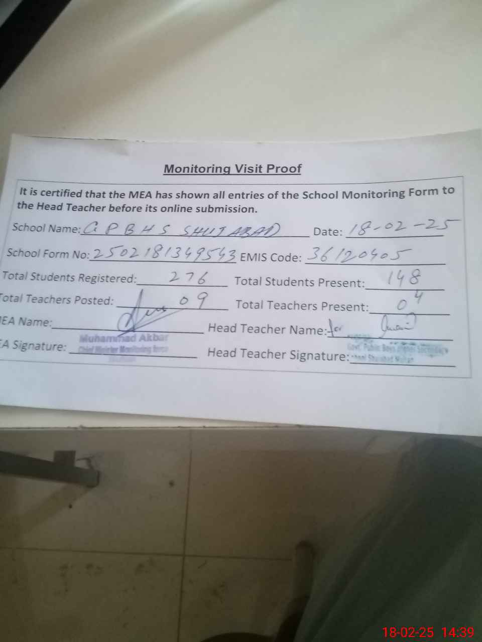 | Attendance Register | Head Teacher | MEA with School | Visit Proof |