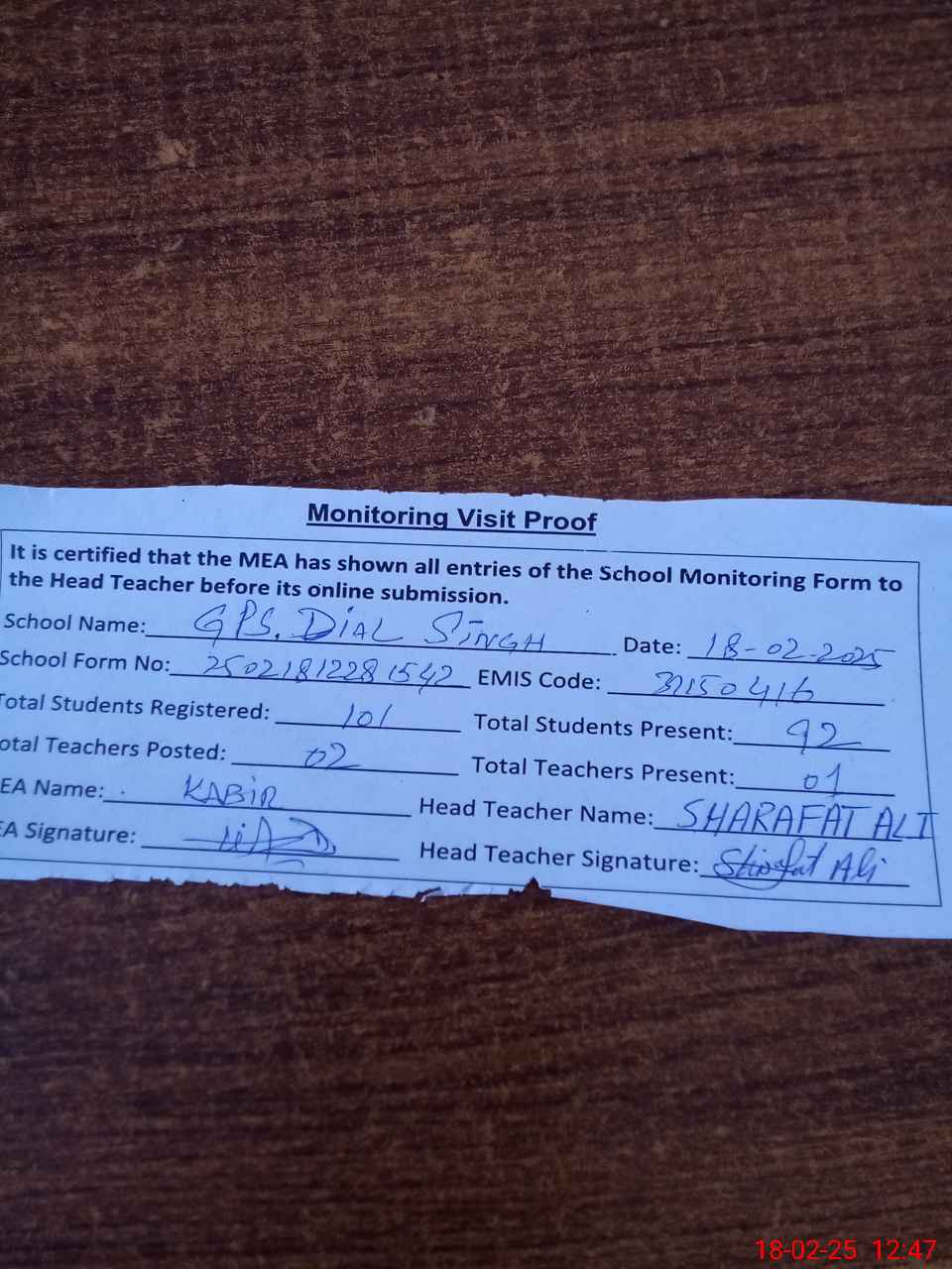 | Attendance Register | Head Teacher | MEA with School | Visit Proof |