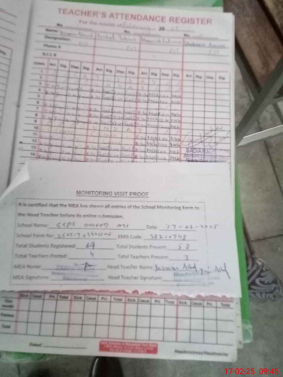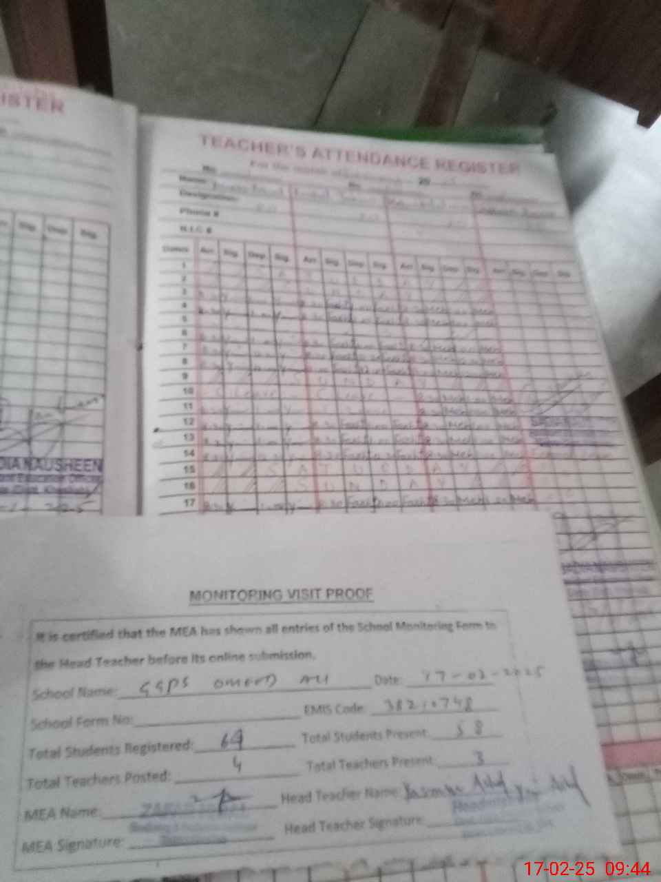 | Attendance Register | Head Teacher | MEA with School | Visit Proof |