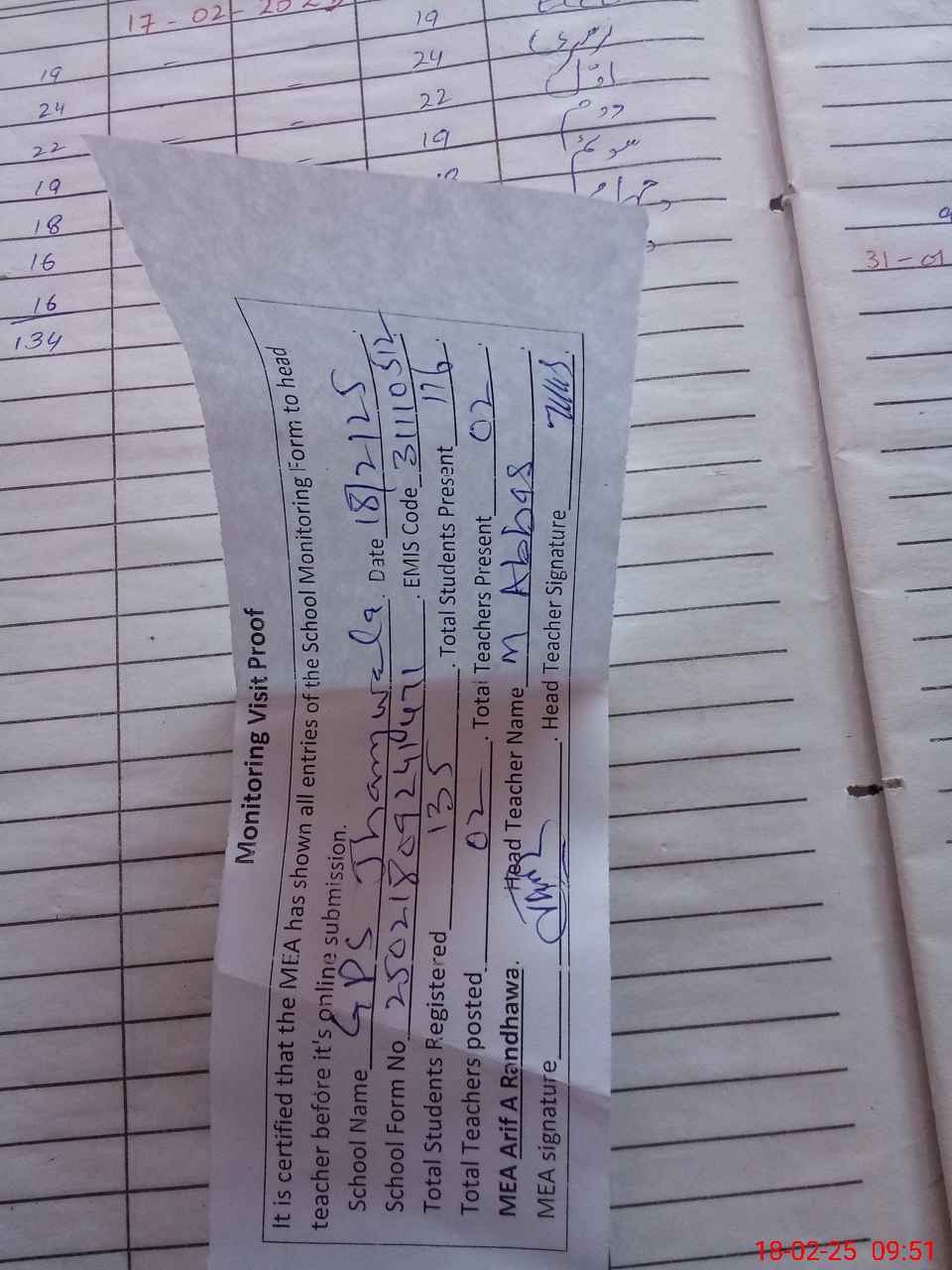 | Attendance Register | Head Teacher | MEA with School | Visit Proof |