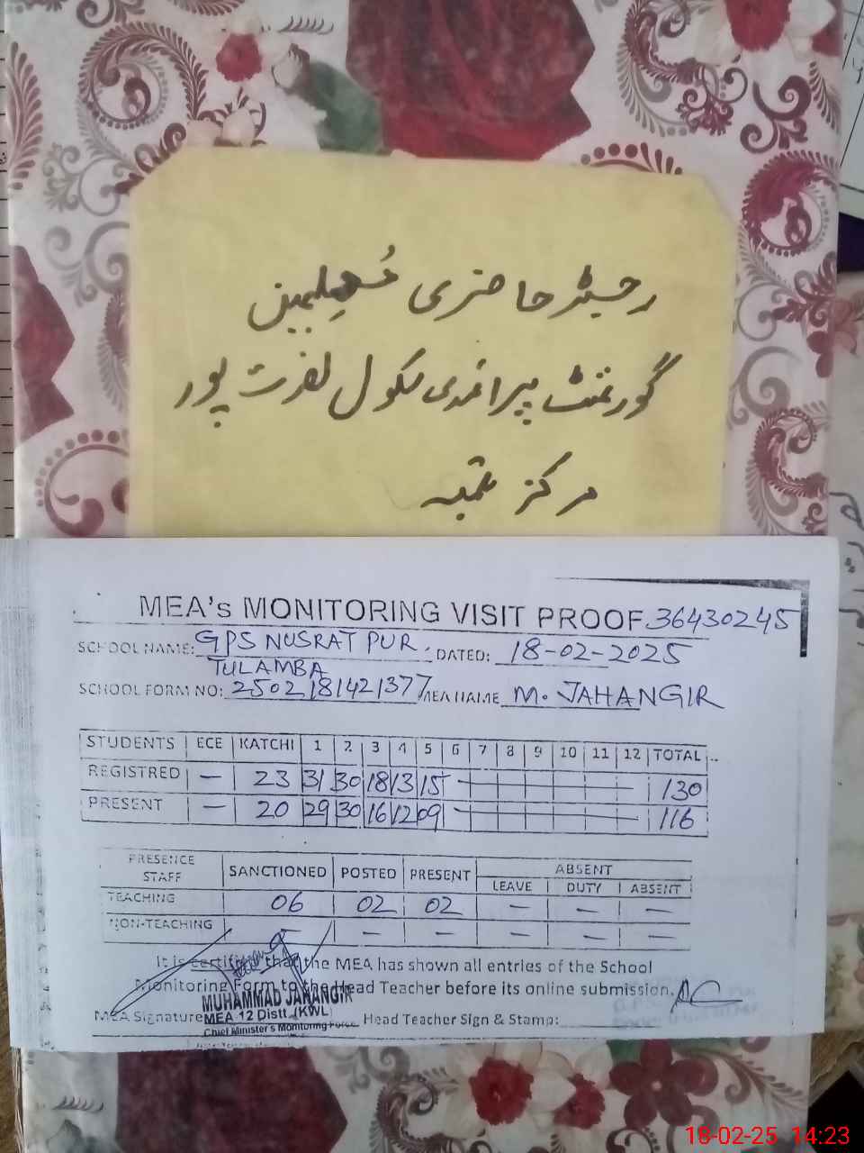 | Attendance Register | Head Teacher | MEA with School | Visit Proof |