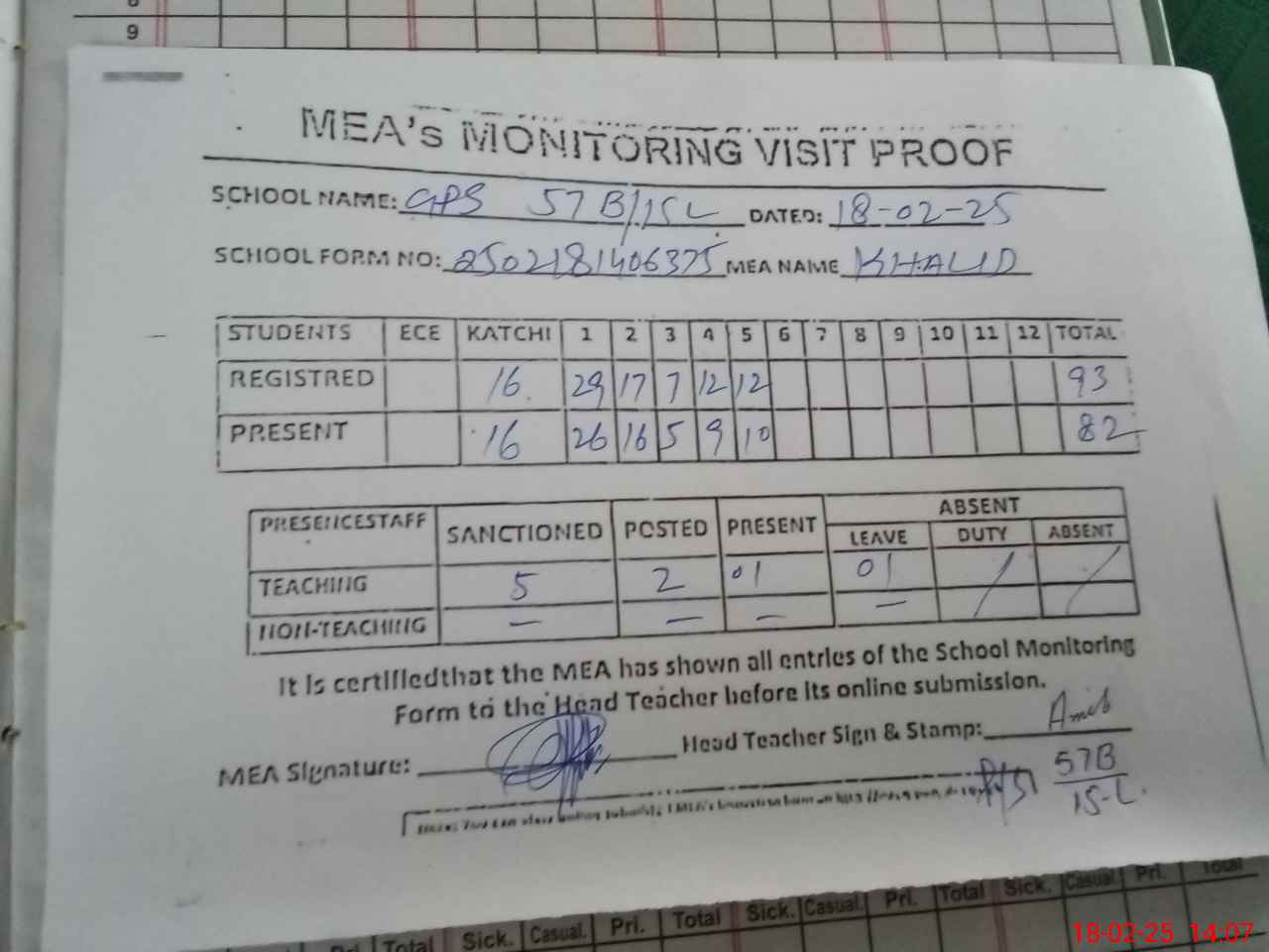 | Attendance Register | Head Teacher | MEA with School | Visit Proof |