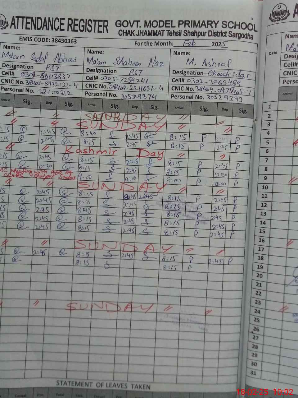 | CNIC | Full Name | Designation | R/C | Absence During Last Calender Month |