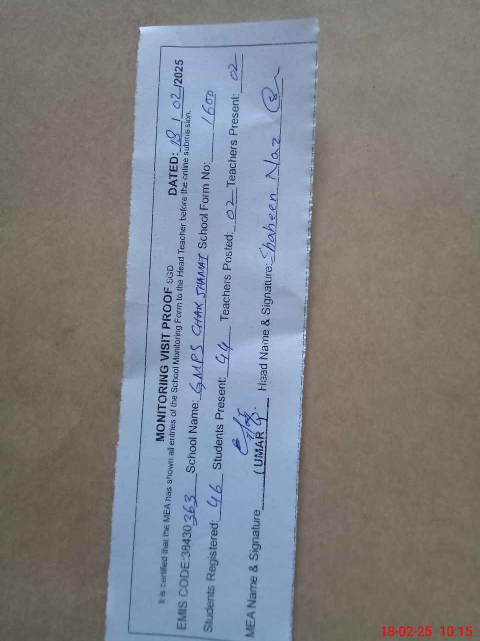 | Certified that this School was Inspected by the Undersigned MEA/DMO Today and the Information Stated Above is as Per Record. | |||||