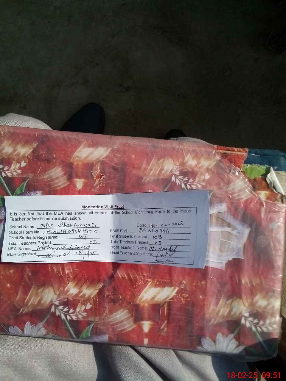 | Attendance Register | Head Teacher | MEA with School | Visit Proof |