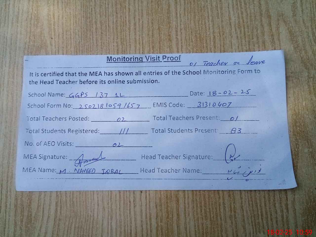 | Attendance Register | Head Teacher | MEA with School | Visit Proof |