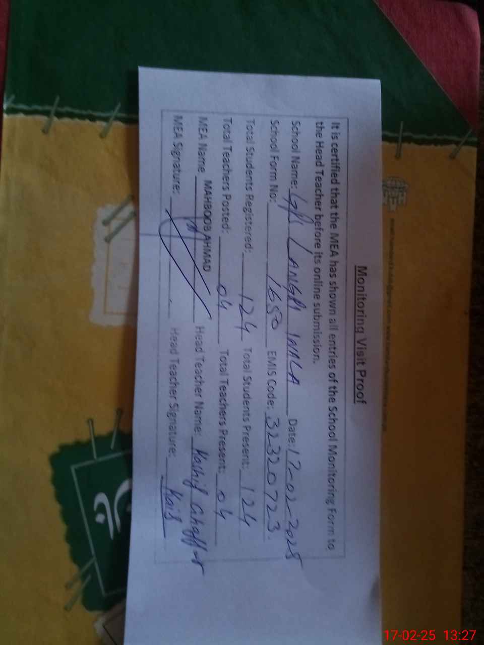 | EMIS Code: 32320723 | Name of School: GPS LANGRI WALA | |||