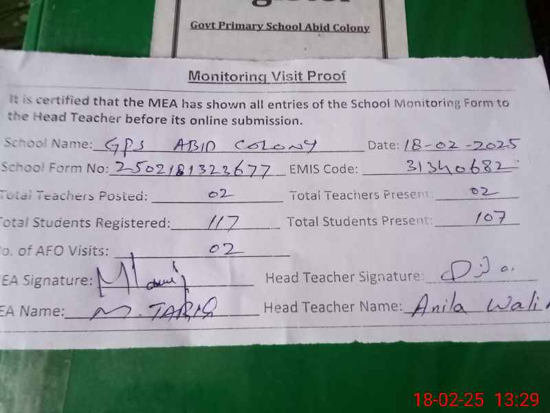 | EMIS Code: 31340682 | Name of School: GPS ABID COLONY | |||
