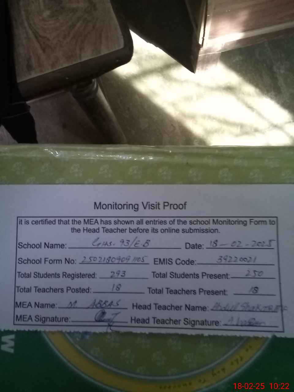 | EMIS Code: 39220021 | Name of School: GHS 93/E-B TEH ARIF WALA | |||