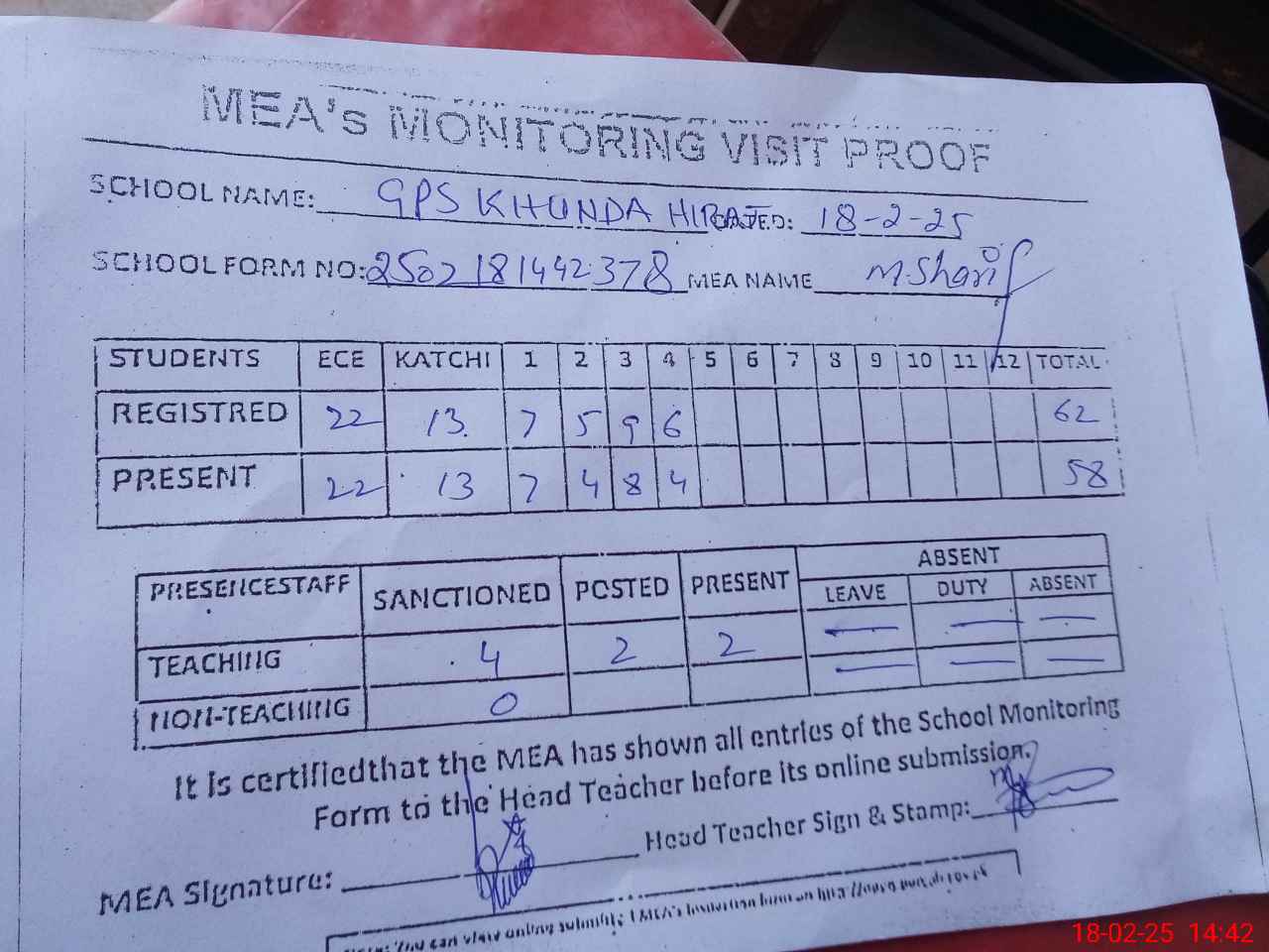 | Attendance Register | Head Teacher | MEA with School | Visit Proof |