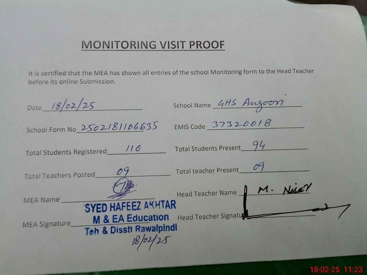 | Attendance Register | Head Teacher | MEA with School | Visit Proof |