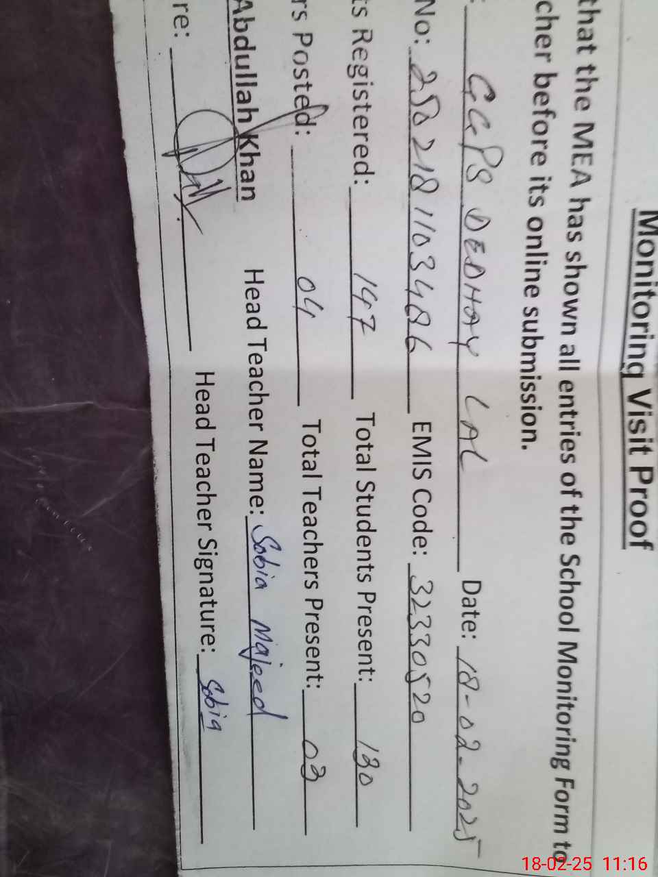 | EMIS Code: 32330520 | Name of School: GGPS DEDHAY LAL | |||