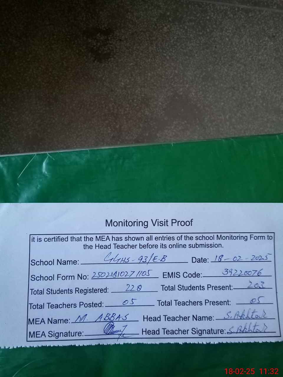 | Attendance Register | Head Teacher | MEA with School | Visit Proof |