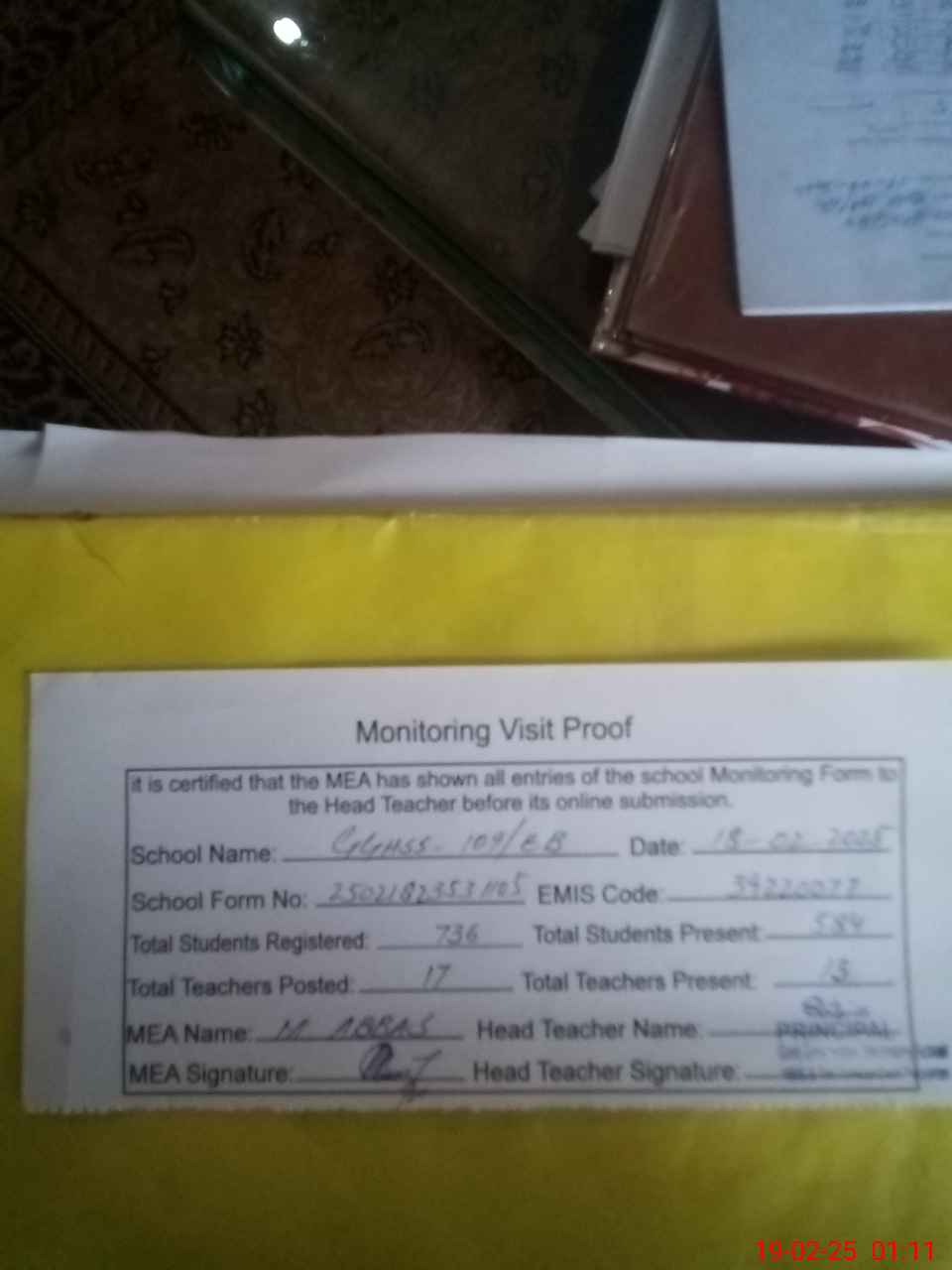 | Attendance Register | Head Teacher | MEA with School | Visit Proof |