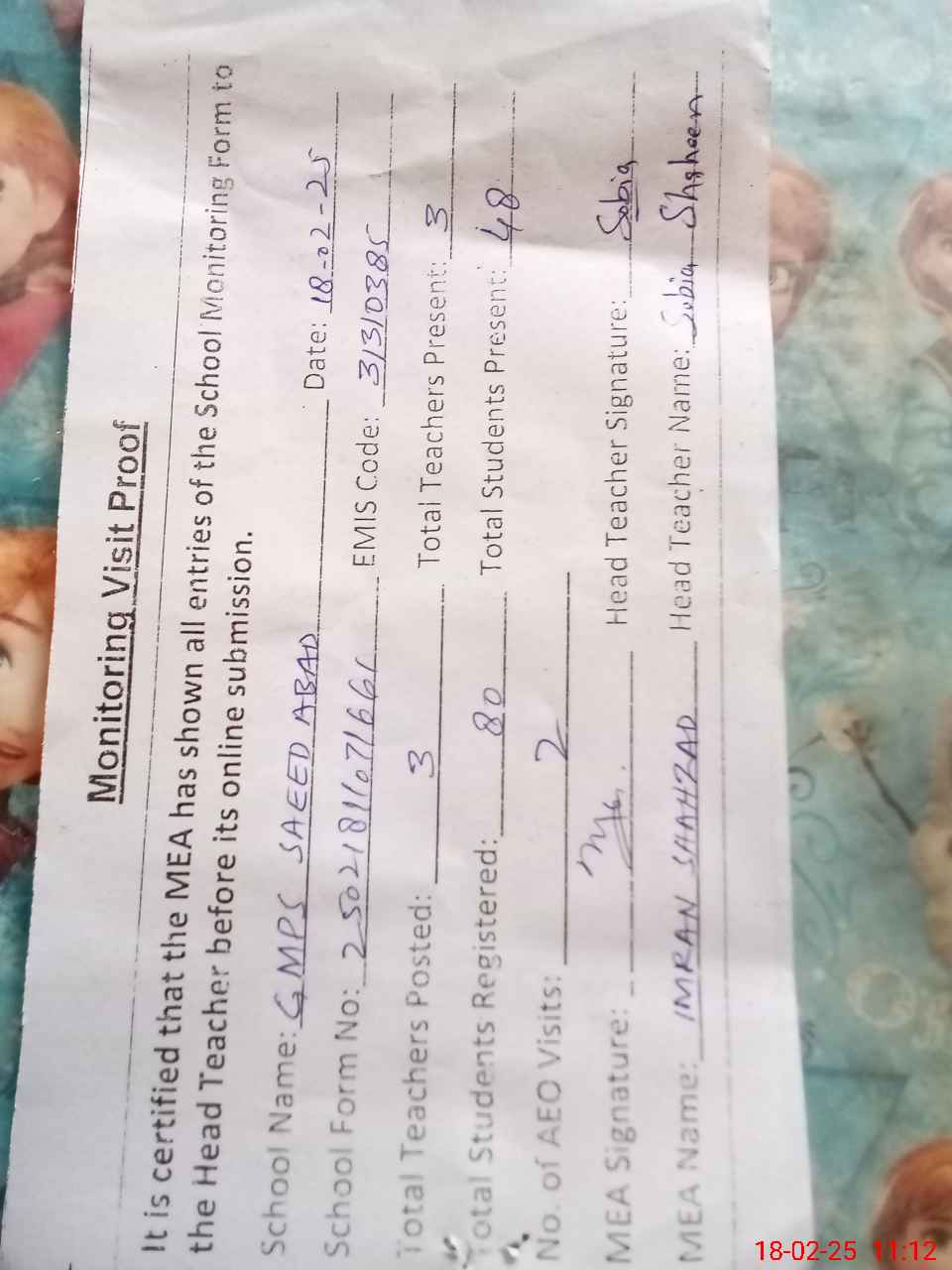 | EMIS Code: 31310385 | Name of School: GMPS SAEED ABAD KHANPUR | |||