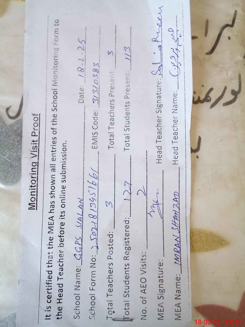 | Attendance Register | Head Teacher | MEA with School | Visit Proof |