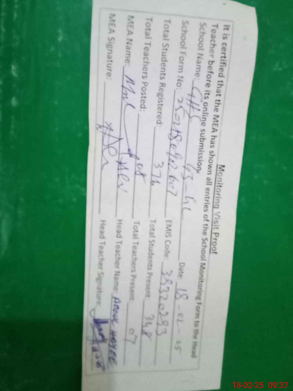 | Attendance Register | Head Teacher | MEA with School | Visit Proof |