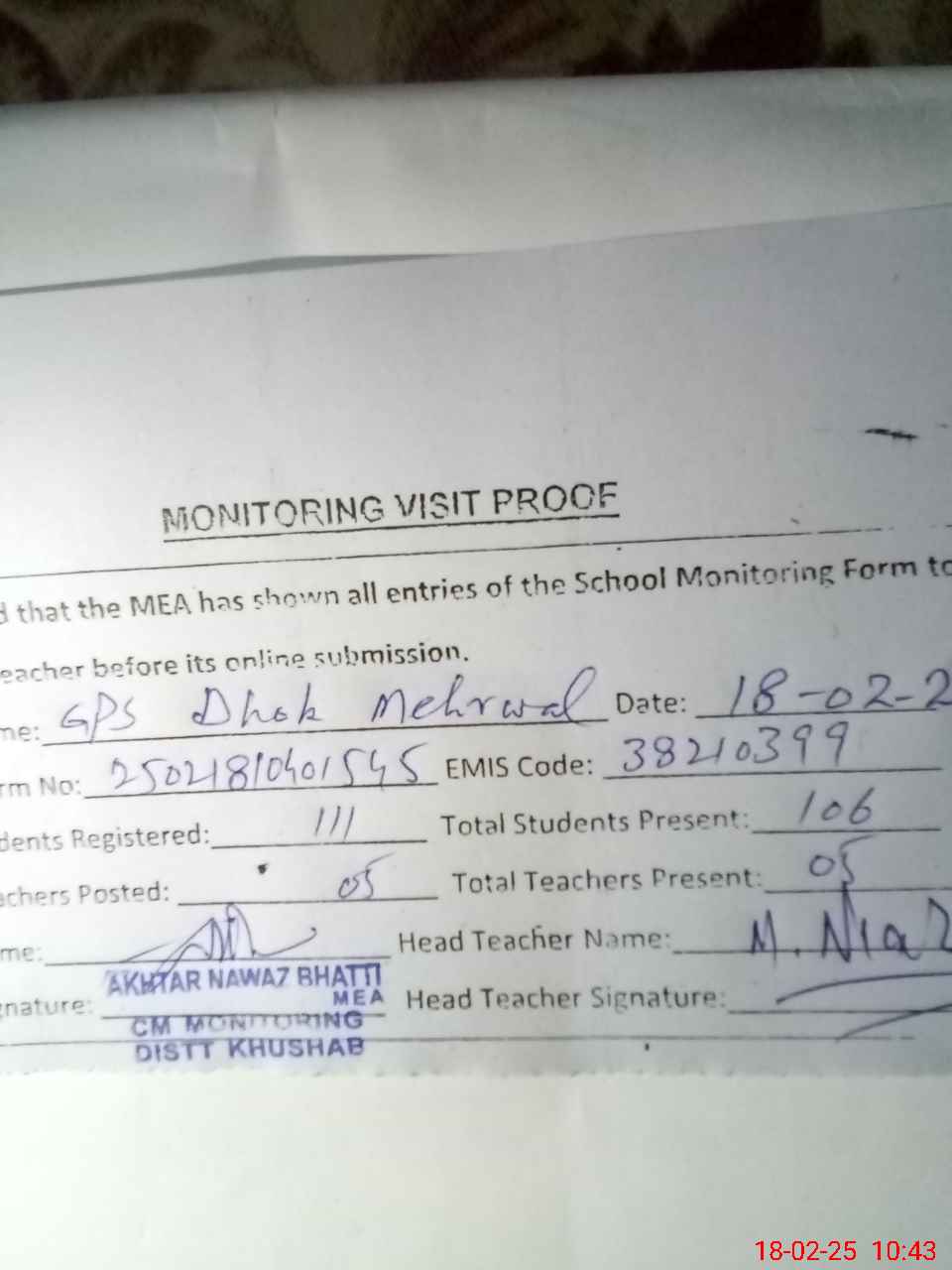 | EMIS Code: 38210399 | Name of School: GPS DHOK MEHRWAL | |||