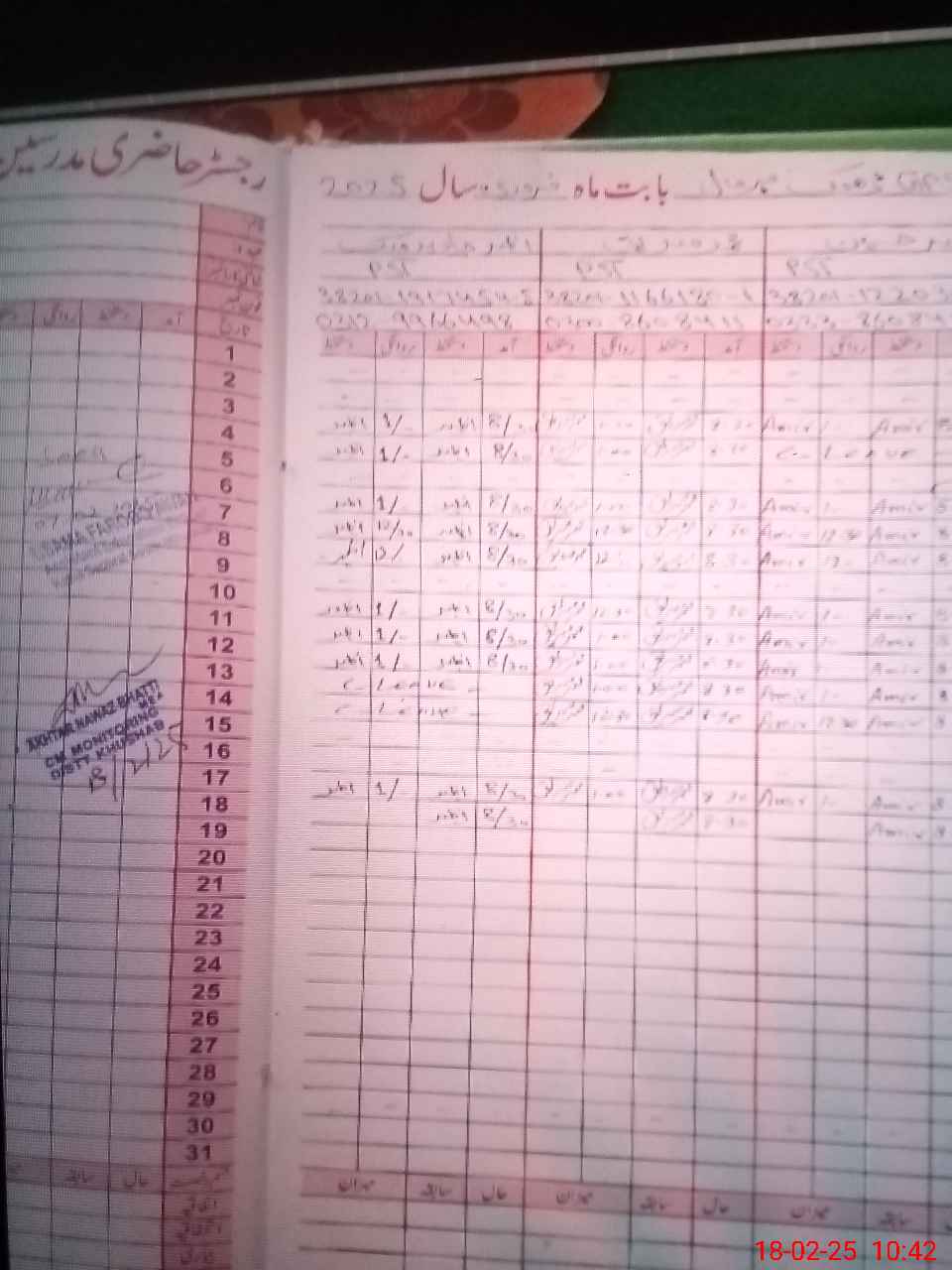 | CNIC | Full Name | Designation | R/C | Absence During Last Calender Month |