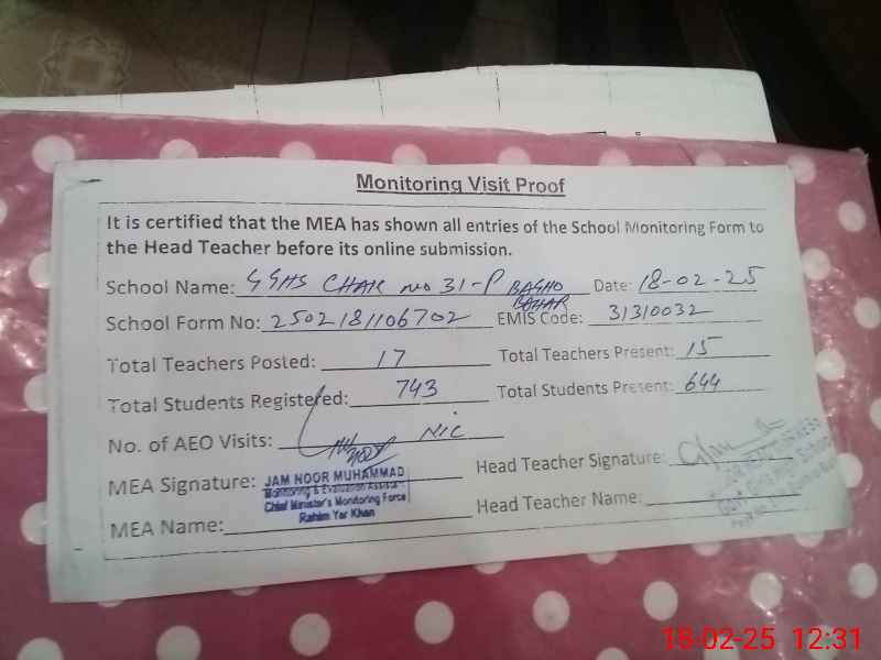 | EMIS Code: 31310032 | Name of School: GGHS CHAK NO. 31/P BAGHO BAHAR | |||