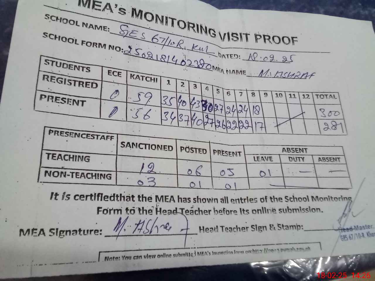 | Attendance Register | Head Teacher | MEA with School | Visit Proof |