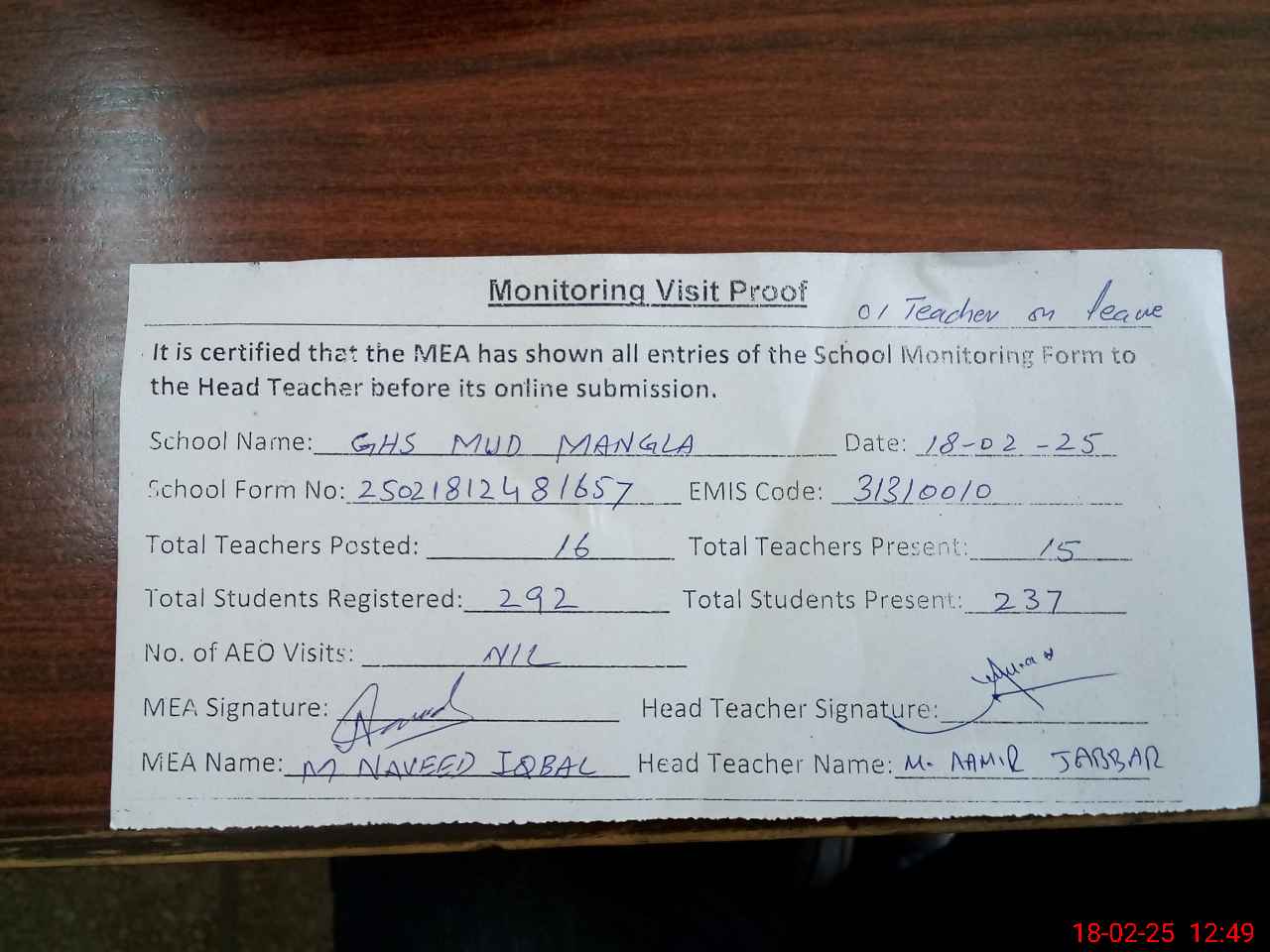 | EMIS Code: 31310010 | Name of School: GHS MUD MANGLA | |||