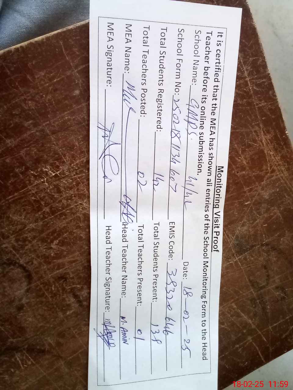 | Attendance Register | Head Teacher | MEA with School | Visit Proof |