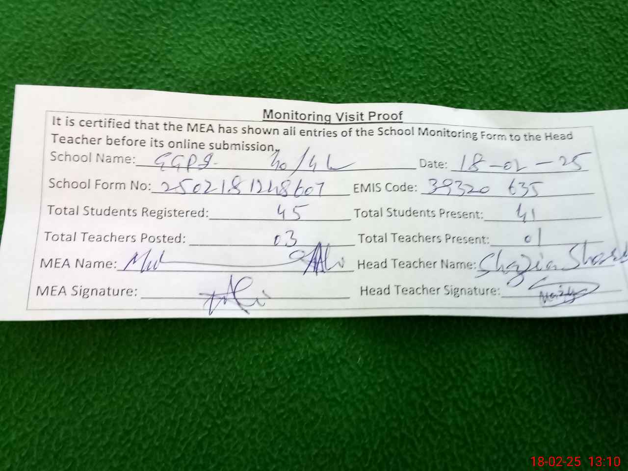 | Attendance Register | Head Teacher | MEA with School | Visit Proof |