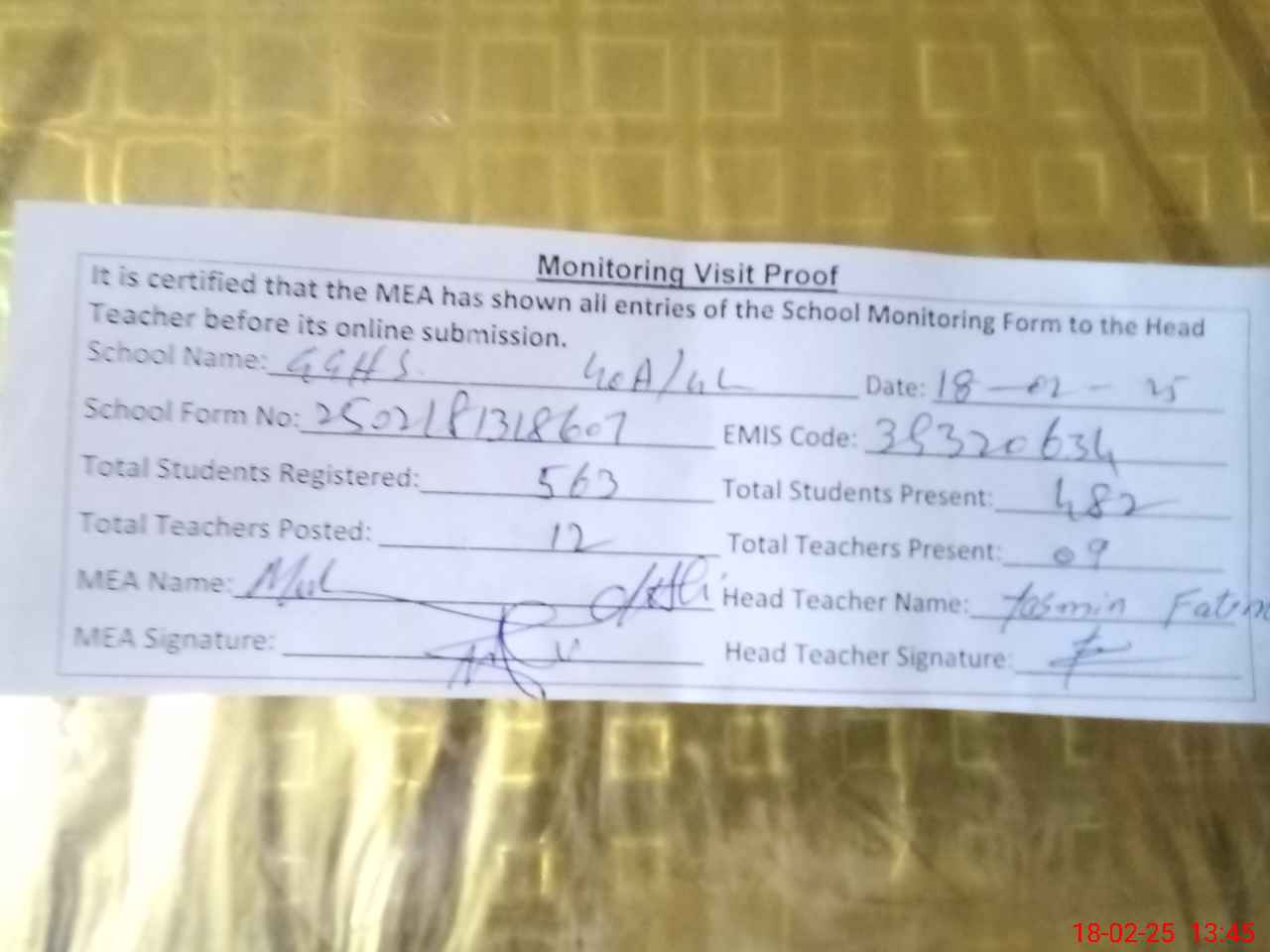| Attendance Register | Head Teacher | MEA with School | Visit Proof |