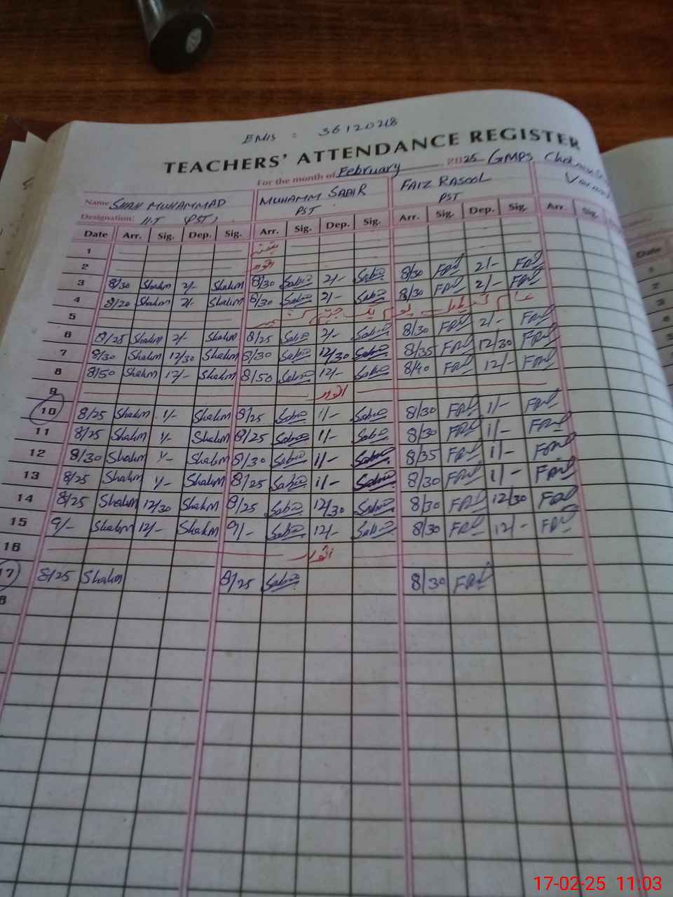 | CNIC | Full Name | Designation | R/C | Absence during last cal. month |